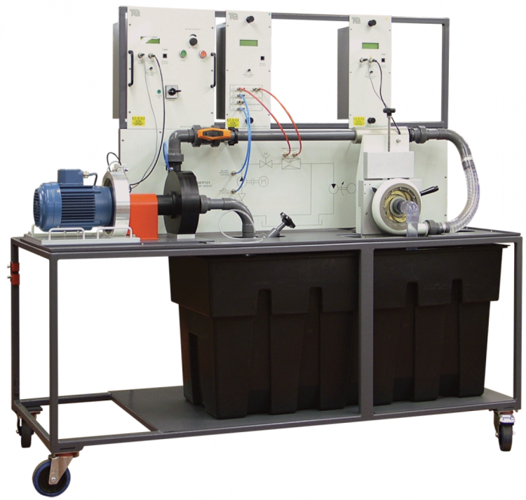 The module includes a centrifugal pump, a Venturi flowmeter, valves, a reservoir and instrumentation; all mounted on a robust, mobile trolley for ease of use. The separate Universal Dynamometer (MFP100) measures and displays the speed and torque of the pump to calculate and display mechanical (shaft) power. Electronic pressure transducers measure the pump inlet and delivery pressures and the Venturi differential pressure (flow rate). Speed is fully variable up to the maximum allowable for the pump. The centrifugal pump is also the power source for the optional turbines: a Pelton wheel, a Francis turbine and Propeller turbine (all available separately). The turbines fit on the separate Turbine Dynamometer (MFP101a). You can only test one turbine at a time.